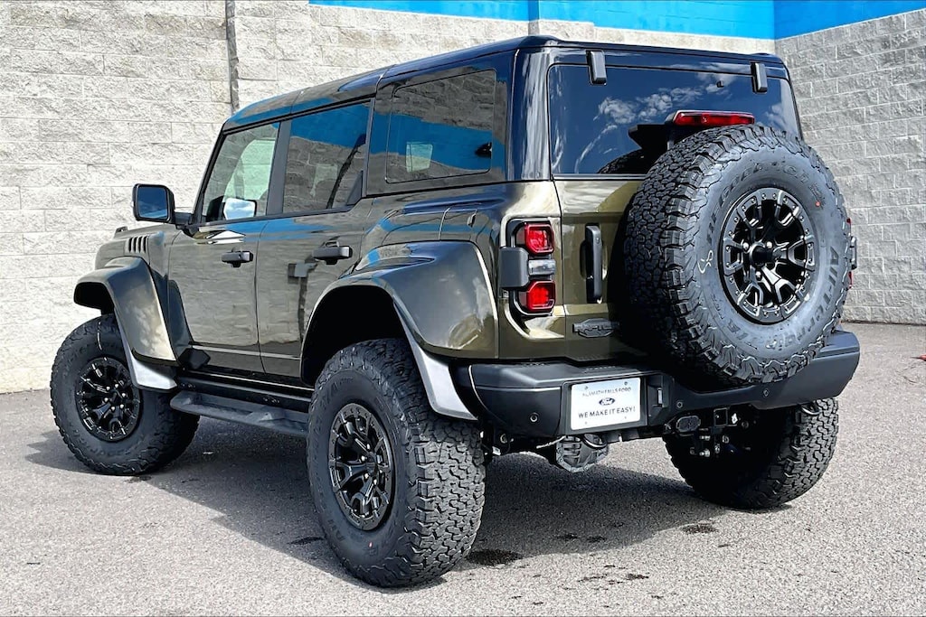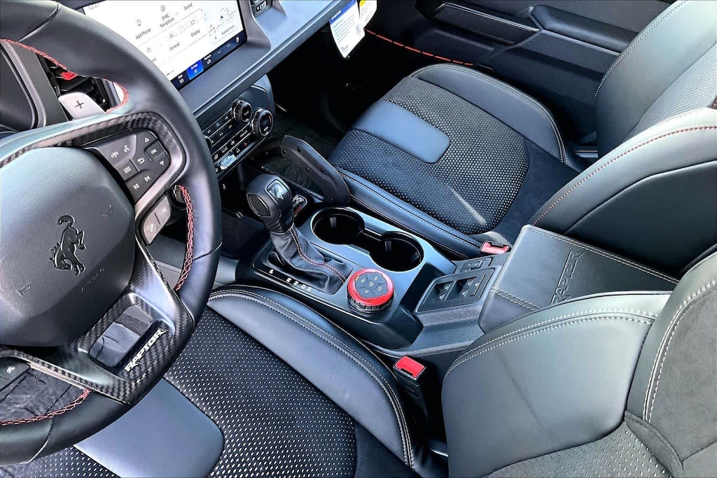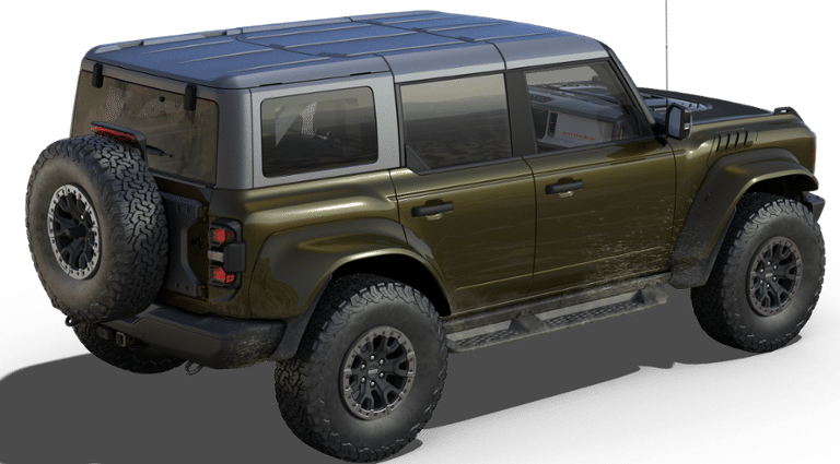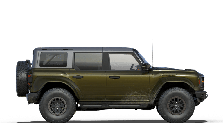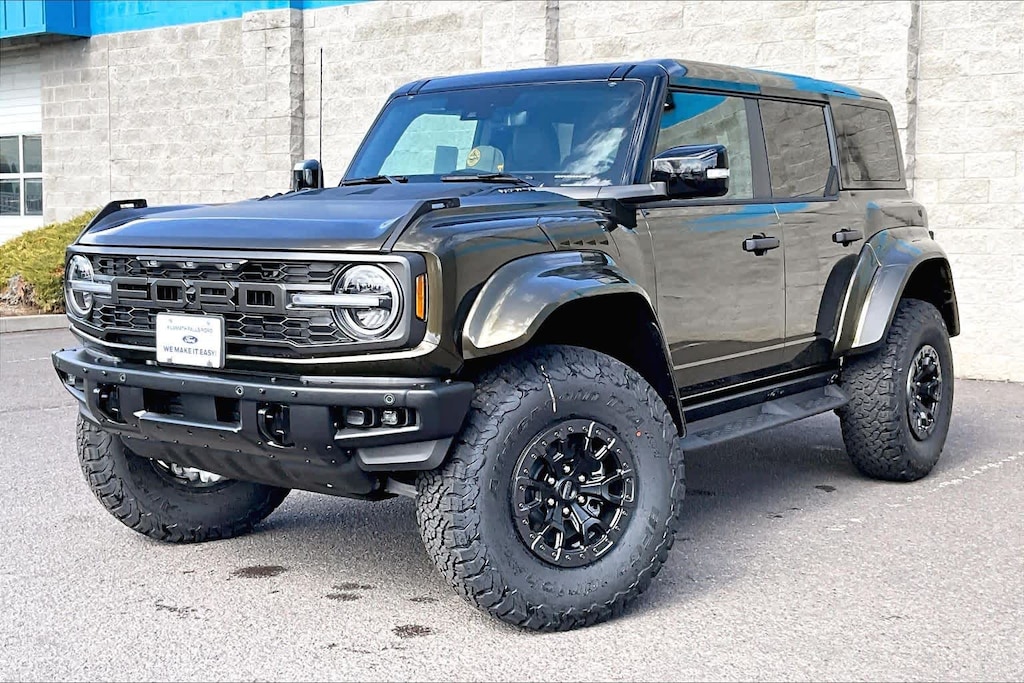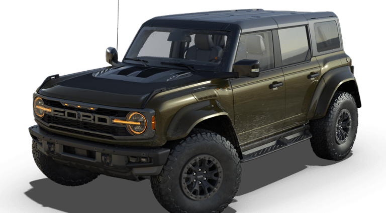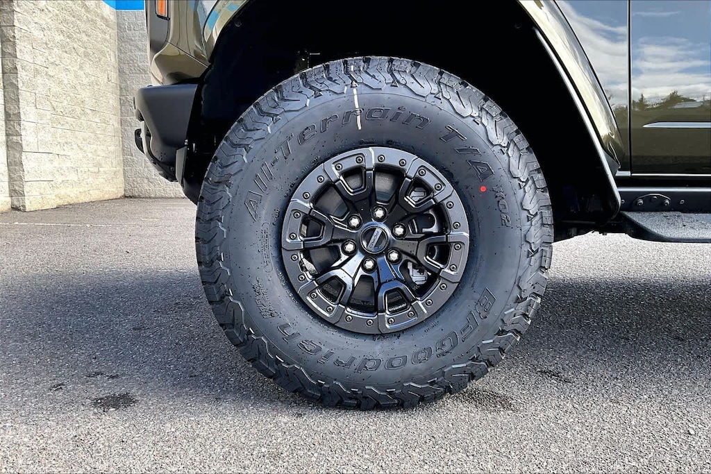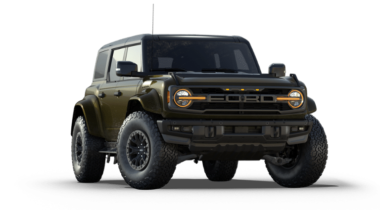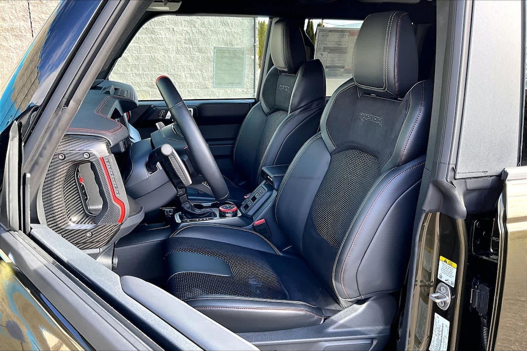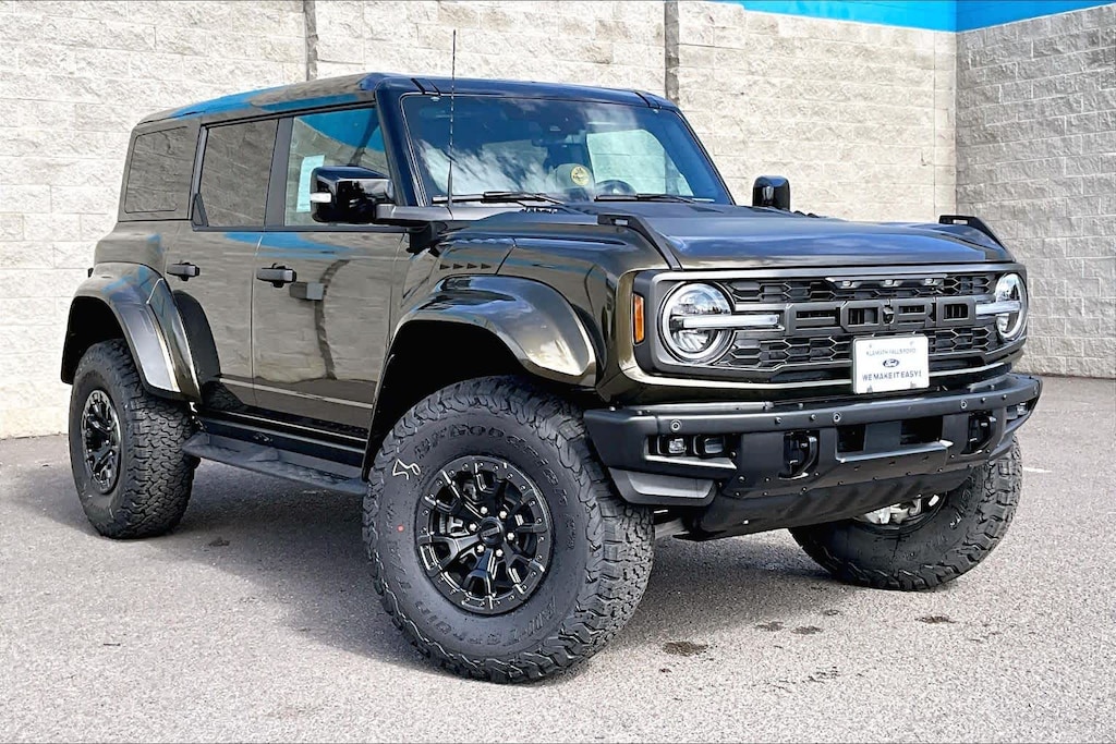 RAPTOR BLACK APPEARANCE PACKAGE unique hood matte black graphics package, Interior Carbon Fiber Pack, Gloss Black Sideview Mirror Skull Caps, Wheels: 17 Dark Carbonized Gray Alloy Painted, Beadlock capable forged, SHADOW BLACK PAINTED HARD TOP Rear-Window Defroster & Washer, Hard Top Sound Deadening Headliner, TRANSMISSION: 10-SPEED AUTOMATIC trail control, trail turn assist and trail one-pedal driving (STD), ENGINE: 3.0L ECOBOOST V6 (STD). Ford Raptor with Shelter Green exterior and Black Onyx interior features a V6 Cylinder Engine with 418 HP at 5750 RPM*.