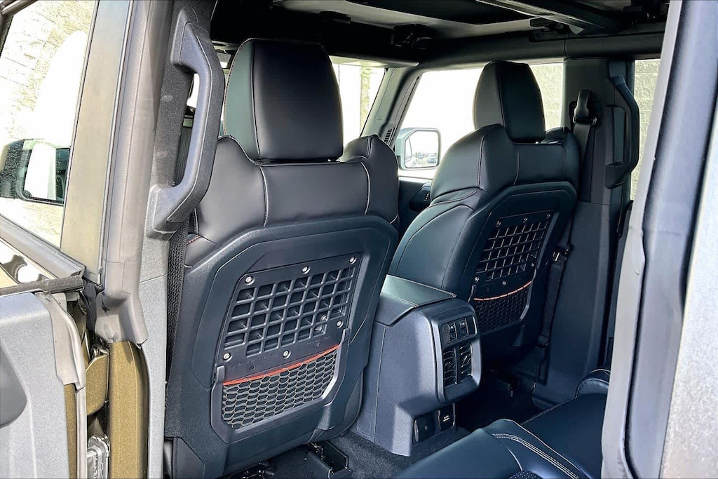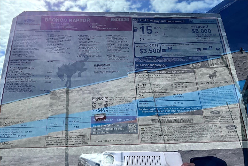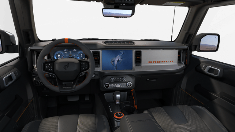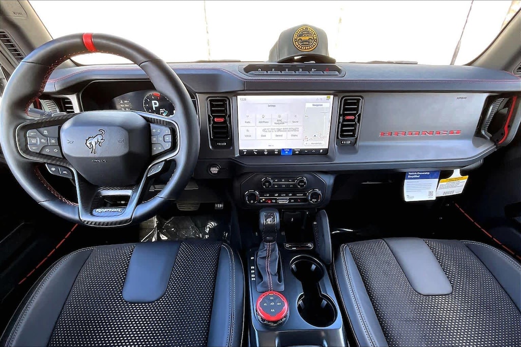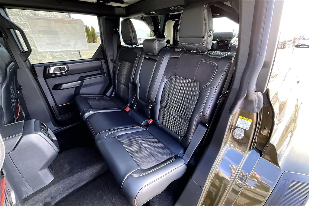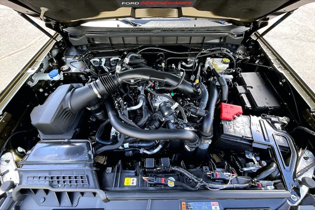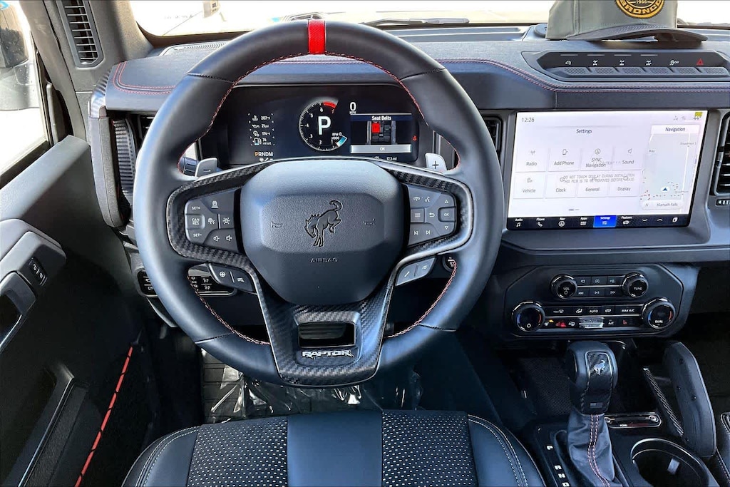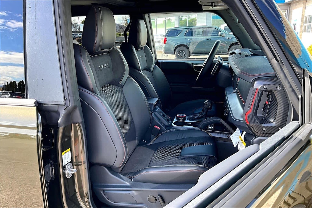 RAPTOR BLACK APPEARANCE PACKAGE unique hood matte black graphics package, Interior Carbon Fiber Pack, Gloss Black Sideview Mirror Skull Caps, Wheels: 17 Dark Carbonized Gray Alloy Painted, Beadlock capable forged, SHADOW BLACK PAINTED HARD TOP Rear-Window Defroster & Washer, Hard Top Sound Deadening Headliner, TRANSMISSION: 10-SPEED AUTOMATIC trail control, trail turn assist and trail one-pedal driving (STD), ENGINE: 3.0L ECOBOOST V6 (STD). Ford Raptor with Shelter Green exterior and Black Onyx interior features a V6 Cylinder Engine with 418 HP at 5750 RPM*.