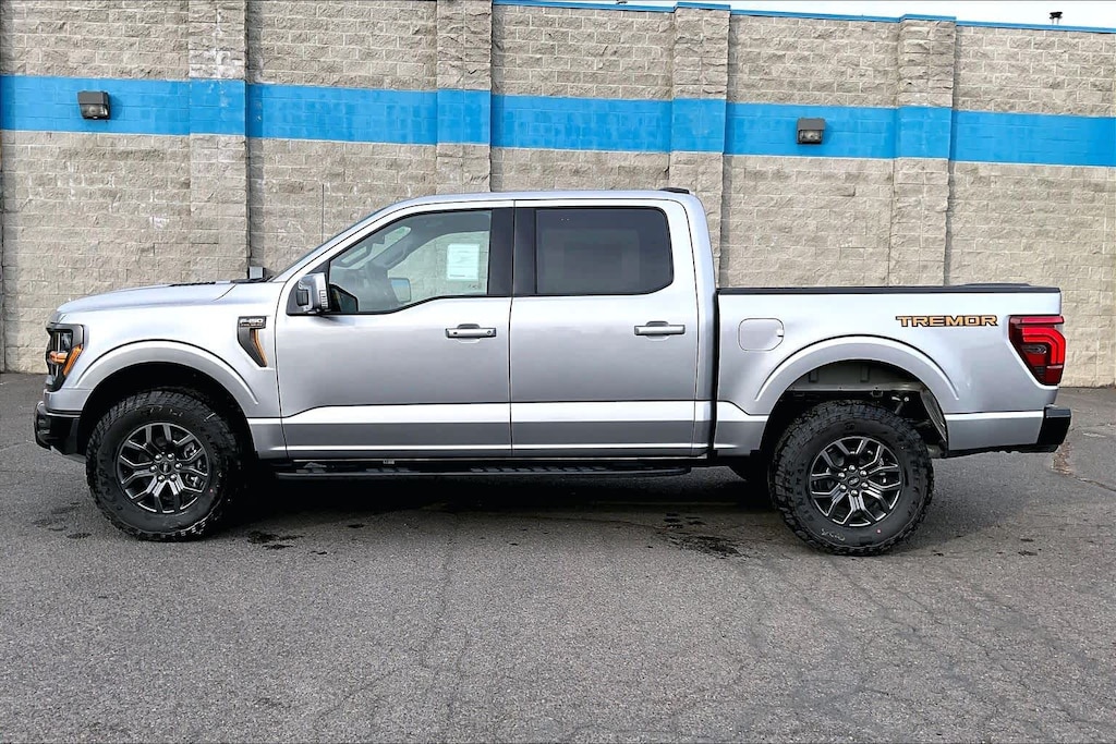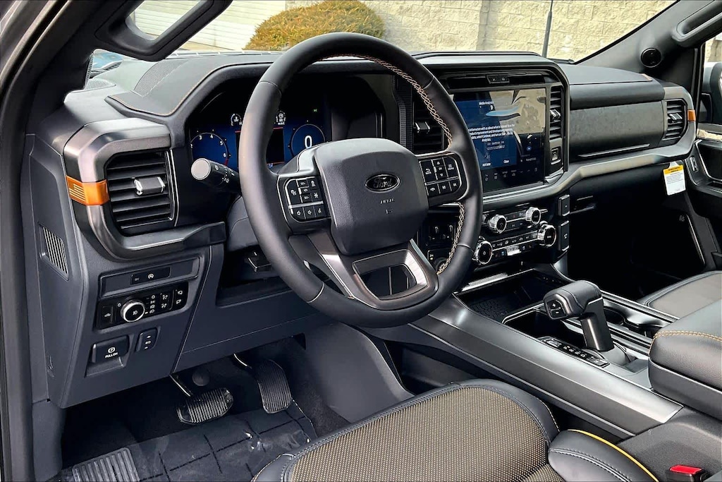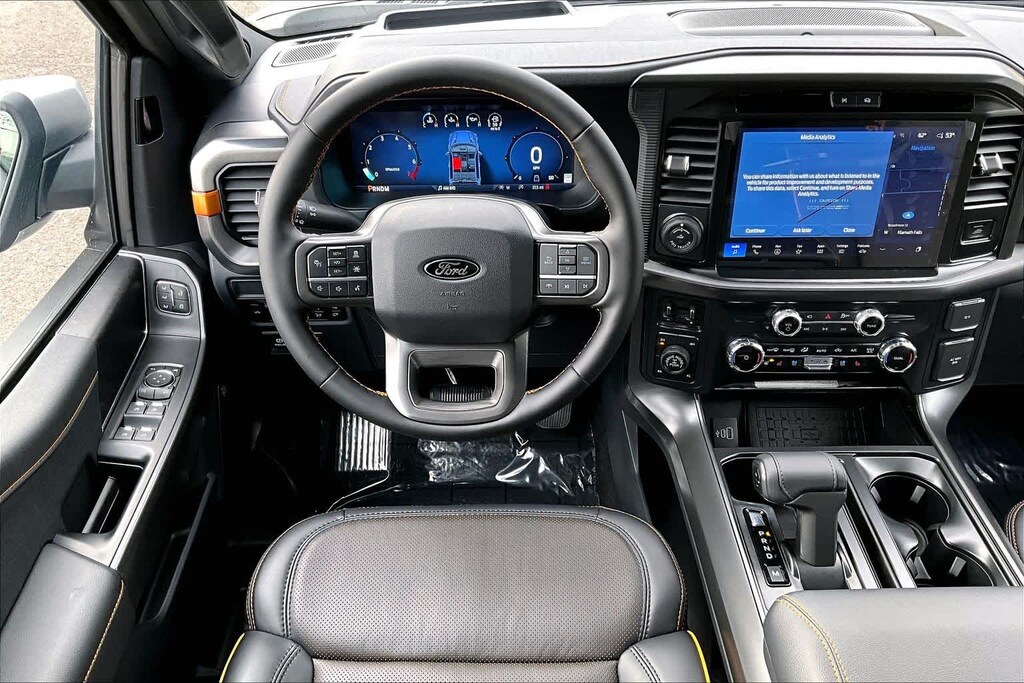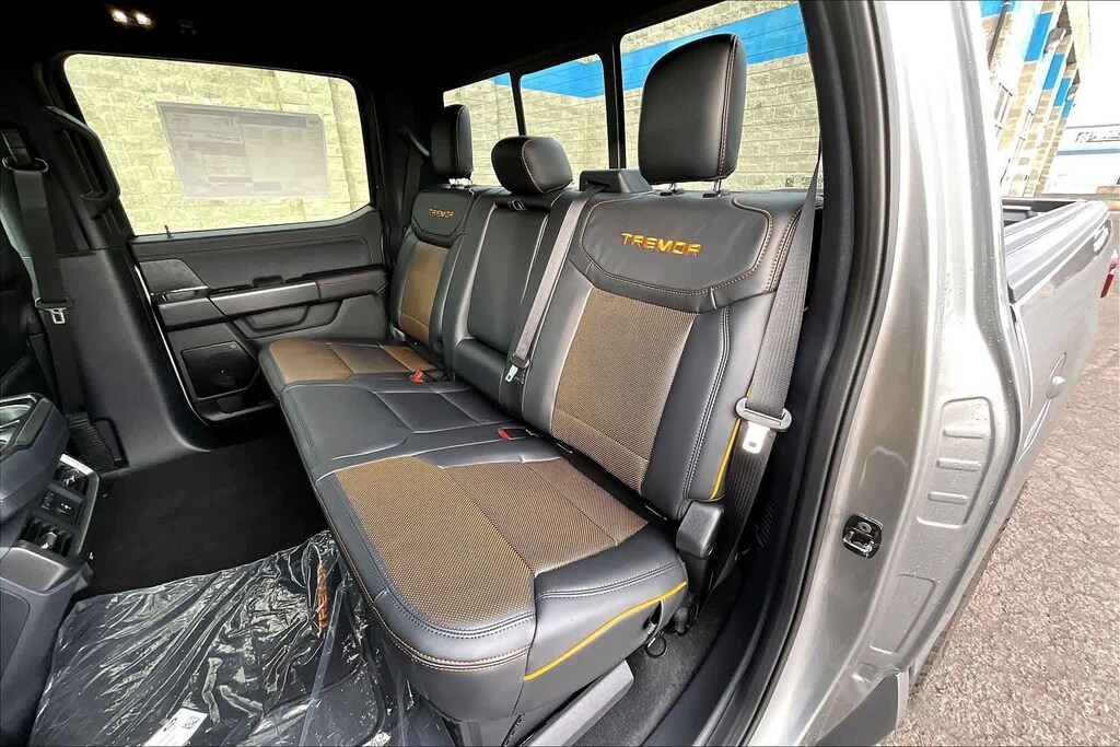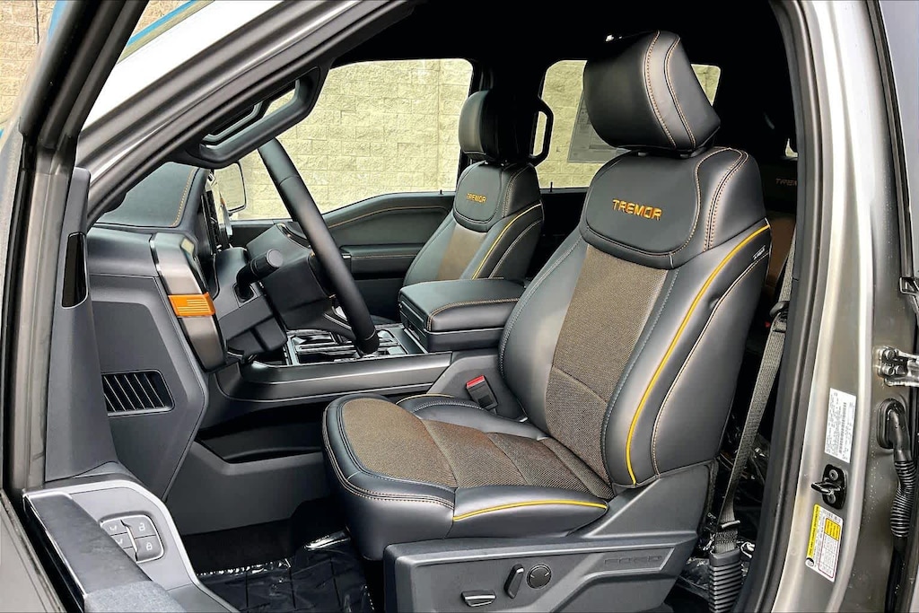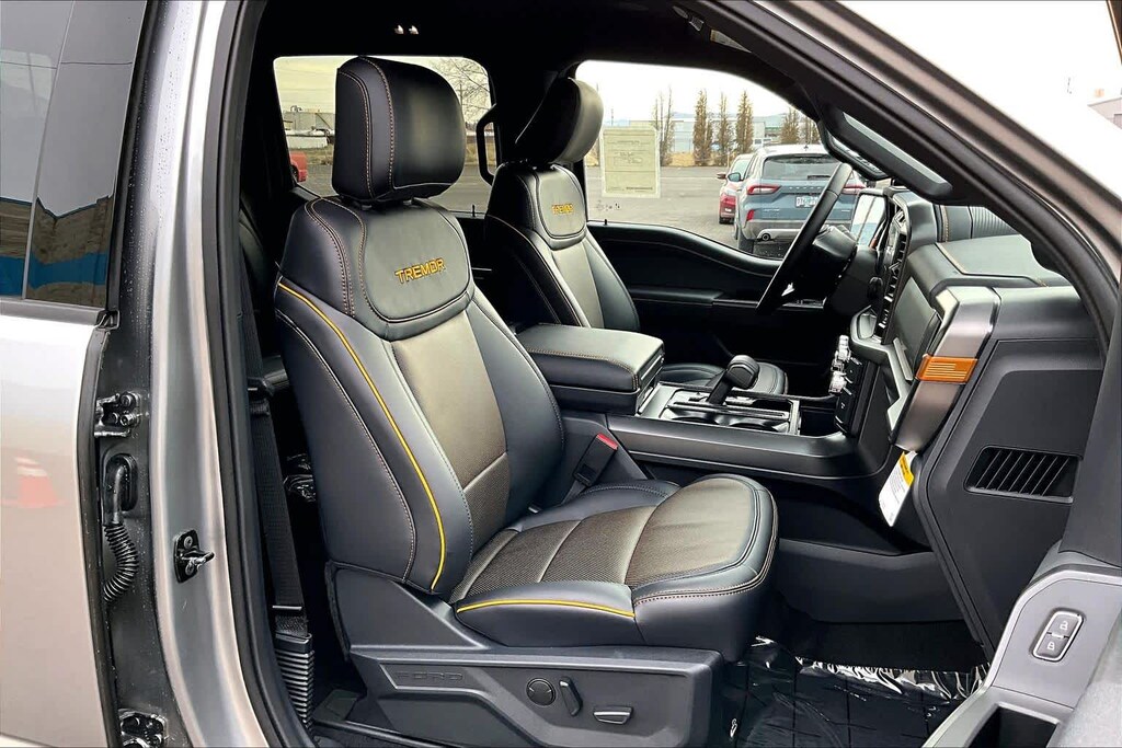 EQUIPMENT GROUP 402A HIGH Power-Adjustable Pedals w/Memory, Bed Utility Package, Tailgate Step w/Tailgate Work Surface, LED Box Lighting, Power Tailgate, 4 Pickup Box Tie-Down Plates, Premium Wrapped Steering Wheel, Modular Front Bumper & Carbon Black Rear Bumper, Mobile Office Package, Wireless Charging, Partitioned Lockable Rear Storage, Console Worksurface, Media Bin Door, Hi-Lock Transfer Case, Power Glass Heated Sideview Mirrors, power-folding, turn signal, auto-dimming feature (drivers side), high-intensity LED security approach lamps, LED sideview mirror spotlights and body-color skull caps, Auto-Dimming Rearview Mirror, Ambient Lighting, LED Taillamps, Two-Speed Automatic AWD w/Mechanical Locking 4WD, Radio: B&O Unleashed Sound System by Bang & Olufsen, HD Radio and 14 speakers, TOUGH BED SPRAY-IN BEDLINER, TRANSMISSION: ELECTRONIC 10-SPEED AUTOMATIC SelectShift w/progressive range select and selectable drive modes: normal, ECO, sport, tow/haul, slippery, deep snow/sand and mud/rut (STD). Ford Tremor with Iconic Silver exterior and Black interior features a 8 Cylinder Engine with 400 HP at 6000 RPM*.