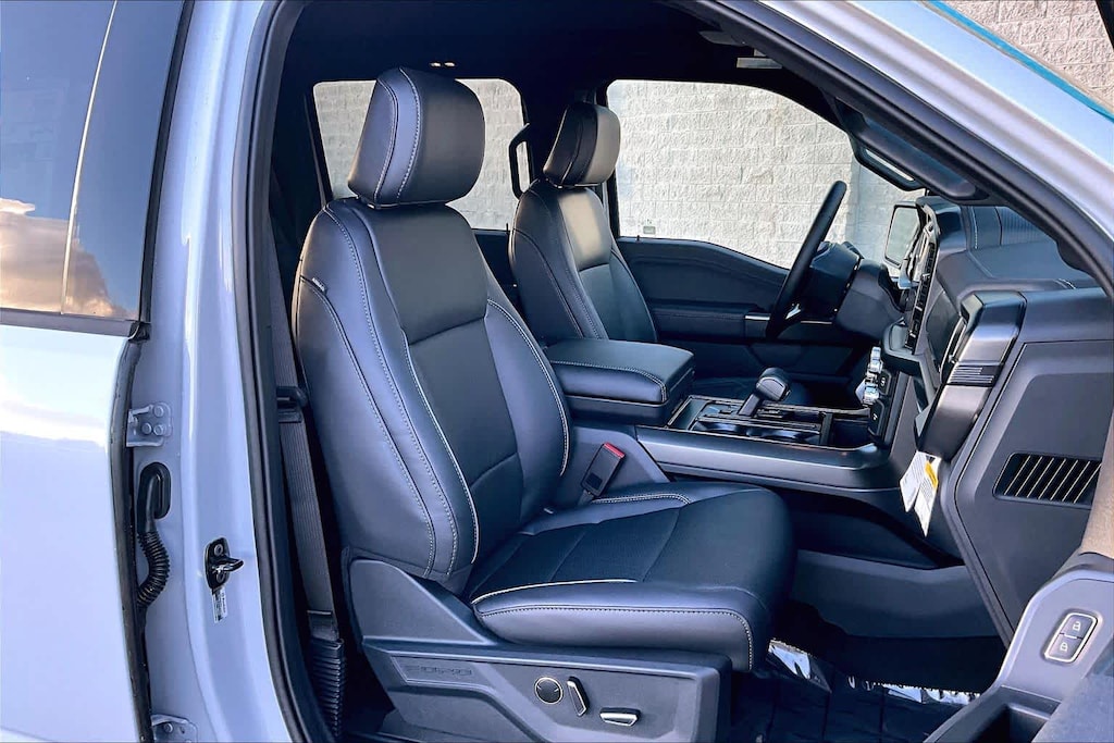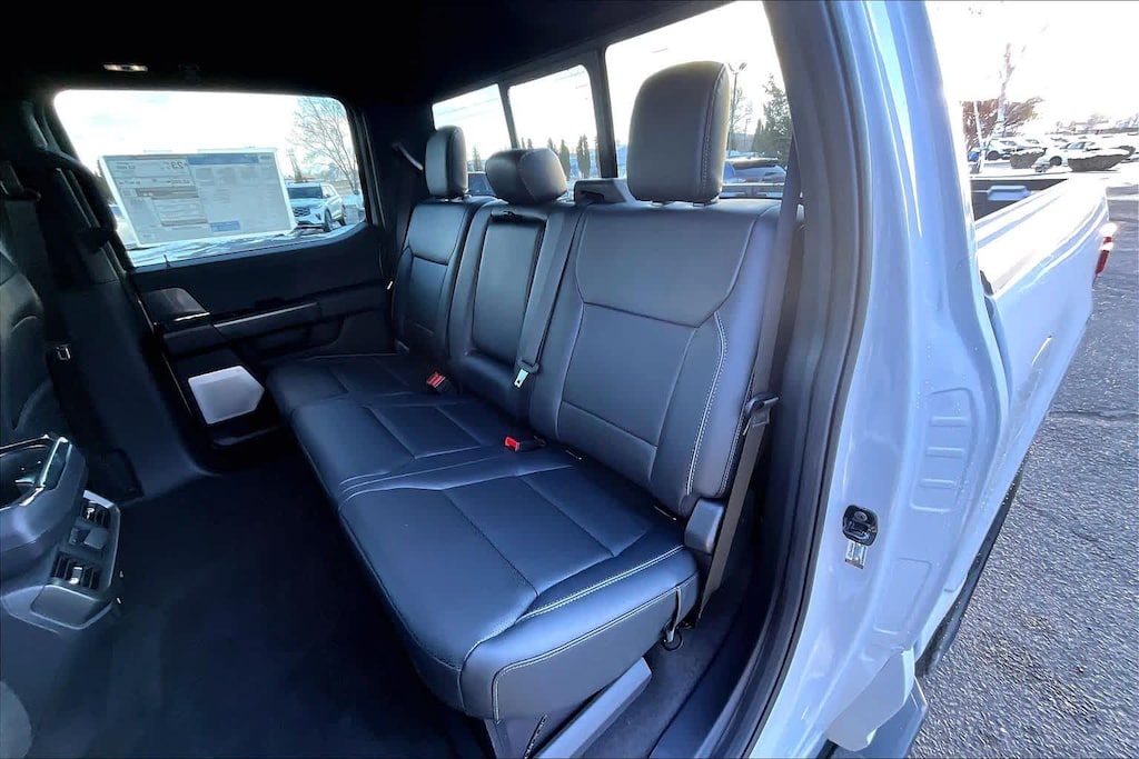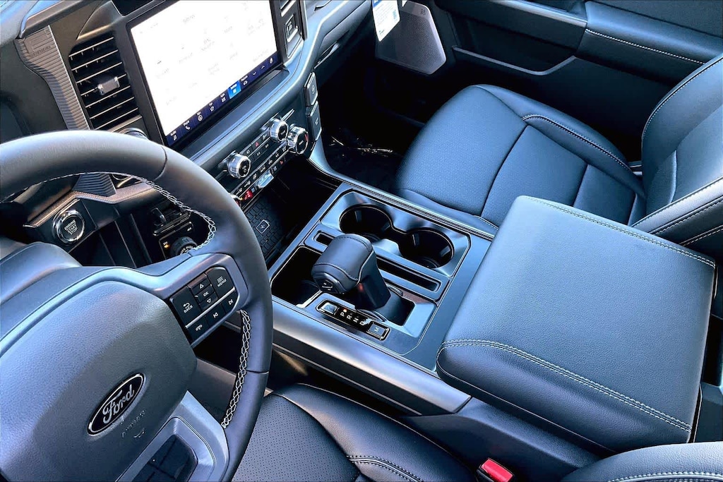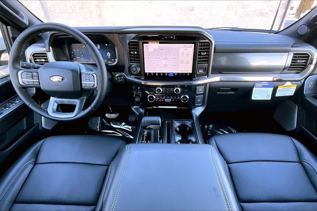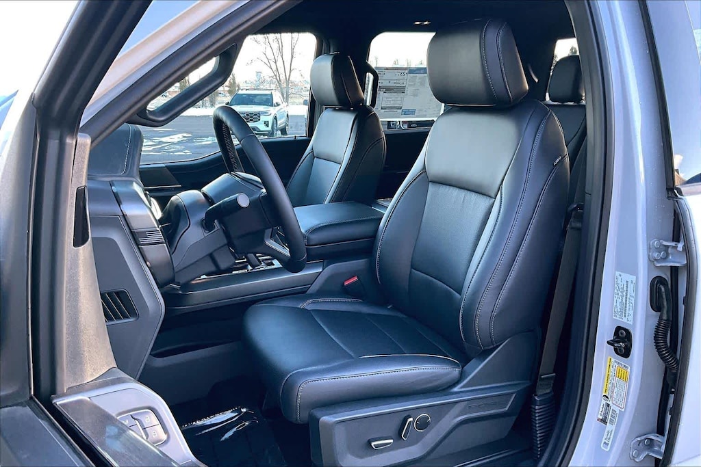 EQUIPMENT GROUP 502A HIGH Ambient Lighting - Ice Blue Color Only, Wheels: 20 Chrome-Like PVD, Radio: B&O Unleashed Sound System by Bang & Olufsen, HD Radio and 14 speakers including subwoofer, 2nd Row Heated Seats, Mobile Office Package, Wireless Charging, Partitioned Lockable Rear Storage, Console Worksurface, 6 Extended Angular Bright Anodized Step Bar, Power-Sliding Rear Window, Heads-Up Display, Illuminated Driver & Passenger Visors, covered mirrors, Tires: 275/60R20 All-Terrain, ENGINE: 3.5L POWERBOOST FULL-HYBRID V6 Pro Power Onboard 2.4KW and removes 36 gallon fuel tank, GVWR: 7,400 lbs Payload Package, Electronic Locking w/3.73 Axle Ratio, TWIN PANEL MOONROOF, TOUGH BED SPRAY-IN BEDLINER. Ford LARIAT with Space White exterior and Black interior features a V6 Cylinder Engine with 430 HP at 6000 RPM*.