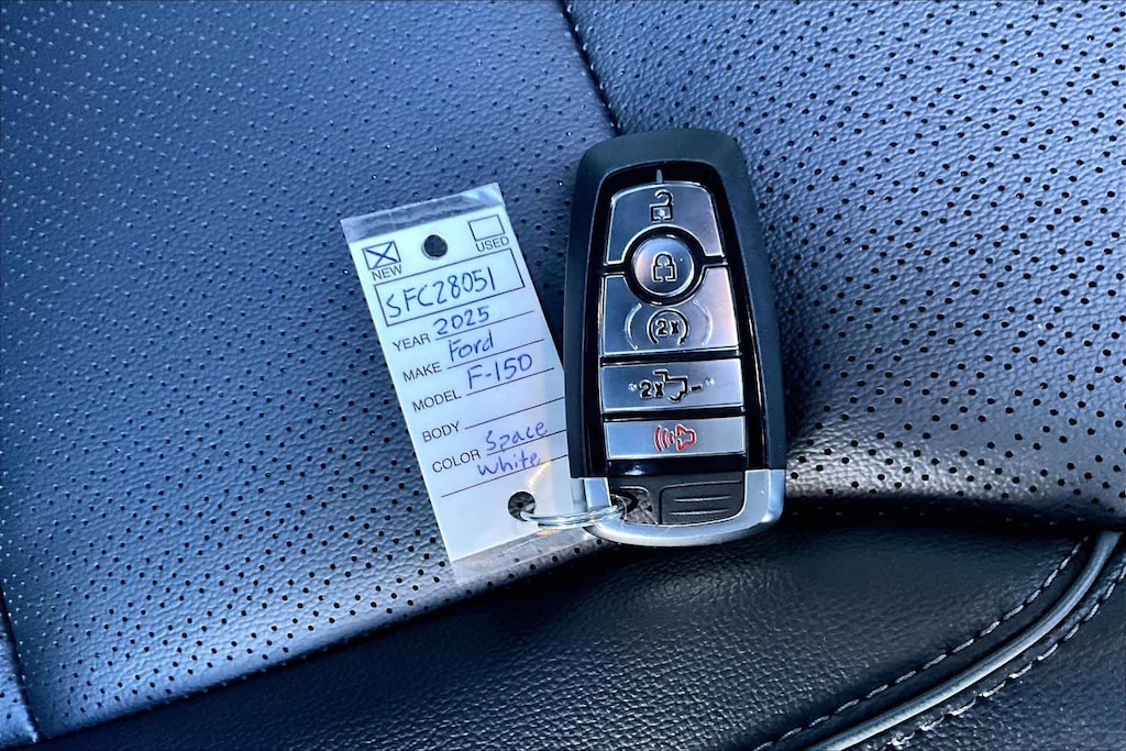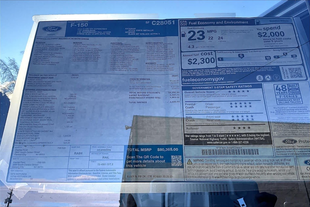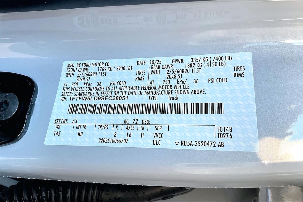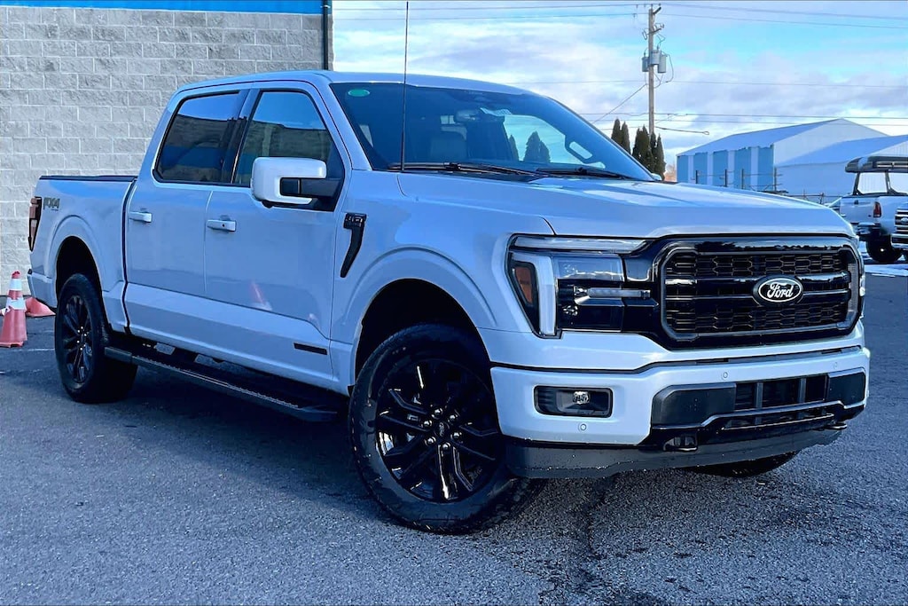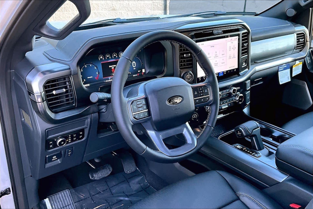 EQUIPMENT GROUP 502A HIGH Ambient Lighting - Ice Blue Color Only, Wheels: 20 Chrome-Like PVD, Radio: B&O Unleashed Sound System by Bang & Olufsen, HD Radio and 14 speakers including subwoofer, 2nd Row Heated Seats, Mobile Office Package, Wireless Charging, Partitioned Lockable Rear Storage, Console Worksurface, 6 Extended Angular Bright Anodized Step Bar, Power-Sliding Rear Window, Heads-Up Display, Illuminated Driver & Passenger Visors, covered mirrors, Tires: 275/60R20 All-Terrain, ENGINE: 3.5L POWERBOOST FULL-HYBRID V6 Pro Power Onboard 2.4KW and removes 36 gallon fuel tank, GVWR: 7,400 lbs Payload Package, Electronic Locking w/3.73 Axle Ratio, TWIN PANEL MOONROOF, TOUGH BED SPRAY-IN BEDLINER. Ford LARIAT with Space White exterior and Black interior features a V6 Cylinder Engine with 430 HP at 6000 RPM*.