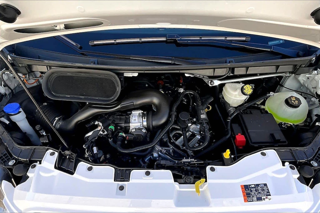 DARK PALAZZO GRAY CLOTH BUCKET SEATS W/ARMRESTS 2-way manual driver seat w/lumbar and 2-way manual passenger seat, TRANSMISSION: 10-SPD AUTOMATIC W/OD & SELECTSHIFT auxiliary transmission oil cooler (STD). Ford Transit Cargo Van with Oxford White exterior and Dark Palazzo Gray interior features a V6 Cylinder Engine with 275 HP at 6250 RPM*.